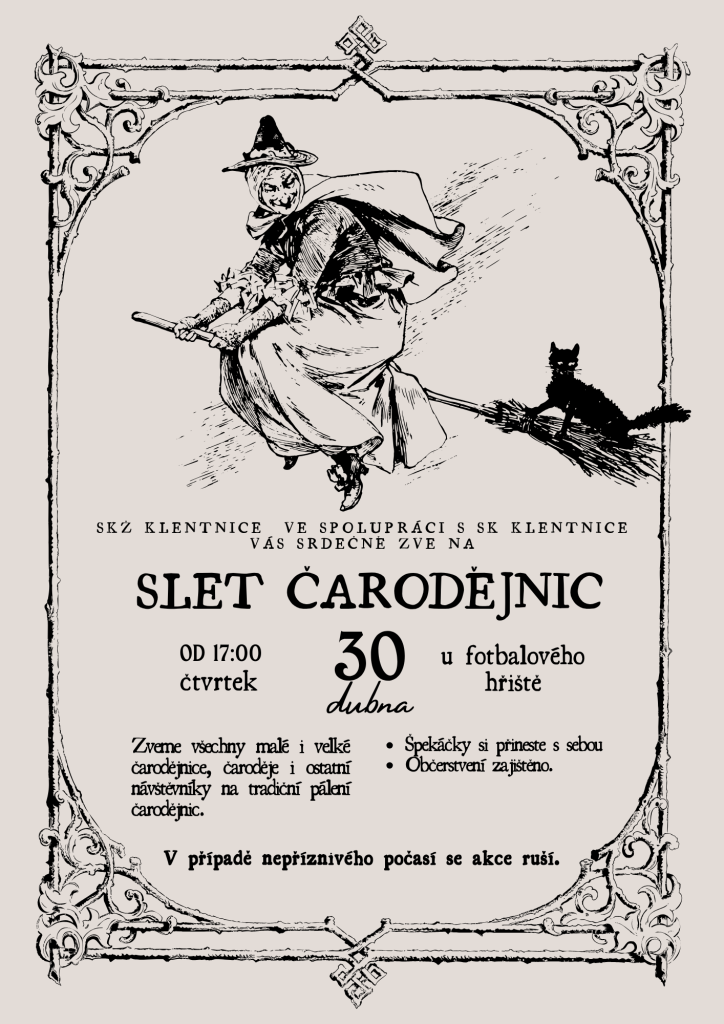 Tradiční akce Slet čarodějnic se uskuteční ve čtvrtek 30.04.2026 od 17:00 u fotbalového hřiště. Zveme všechny malé i velké čarodějnice a čaroděje, kteří se chtějí zapojit do této oblíbené tradice. Účastníci si mohou přinést špekáčky, občerstvení bude zajištěno. V případě nepříznivého počasí se akce bohužel ruší, proto sledujte aktuální informace.